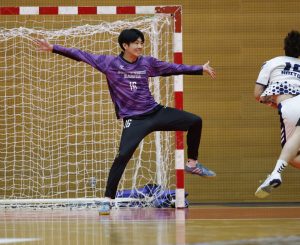 前半20分46秒には#17髙野がレッドカードで失格になりましたが、チームは動じません。24分31秒には怪我から復帰した#20渡部が流れるようなパスワークから復帰後初ゴールを決めて、20-10のダブルスコアに。さらにGK#16岡本(大)がビッグセーブを見せると、#18櫻井がループシュートを決めます。終了間際にも#20渡部が豪快なカットインシュートをねじ込み、23-11とEFBMをダブルスコアのままハーフタイムを迎えました。