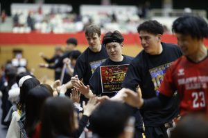 さらに、#10岡本(翔)、#25山田が連続得点を重ねるなど得点ラッシュは止まらず、前半12分18秒には11-3とリードを拡大。EFBMはタイムアウトで流れを変えようと試みますが、#8富永のノールックパスから#17髙野のゴールにつなげ、#33田代がピボットシュート、ループシュートを連続で放ってさらに点差を広げます。